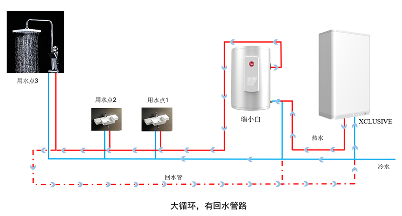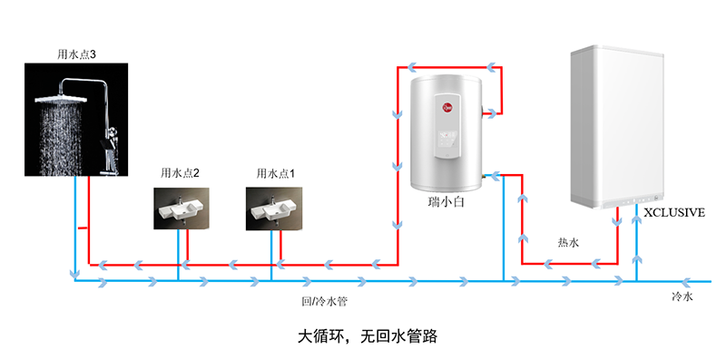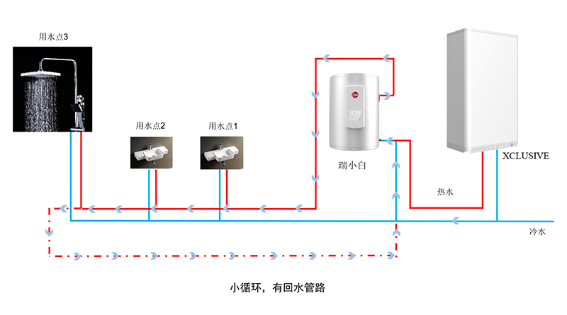 *小循环:小户型,循环管路较短(30m以下),优先使用瑞小白内部热水,实现全屋热水循环;