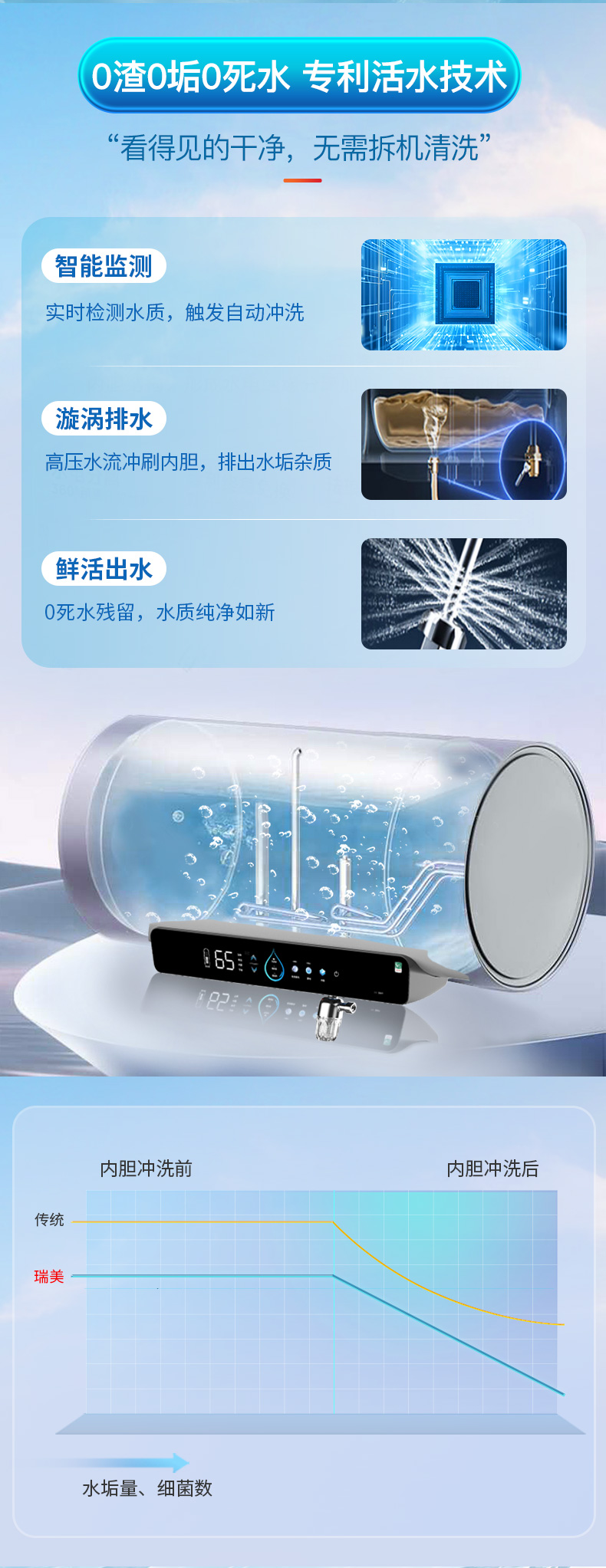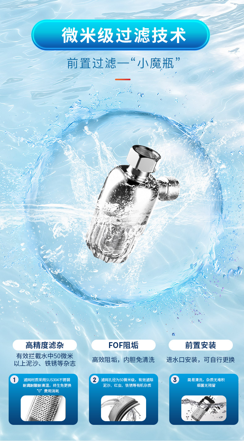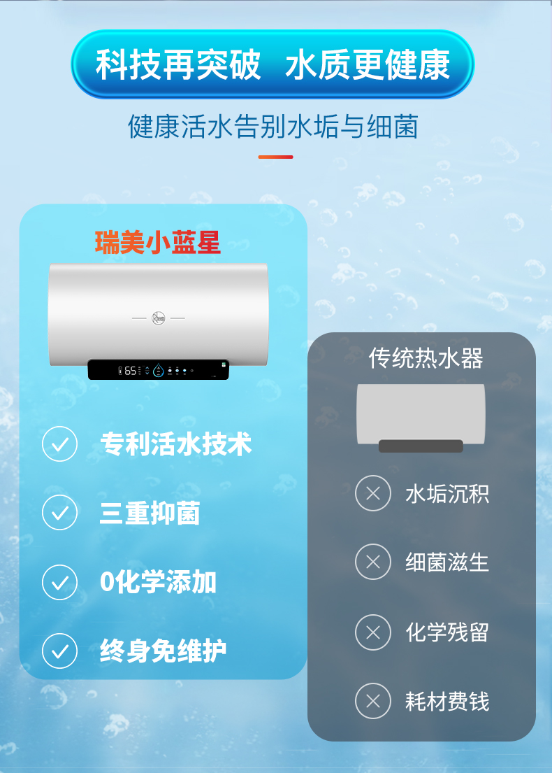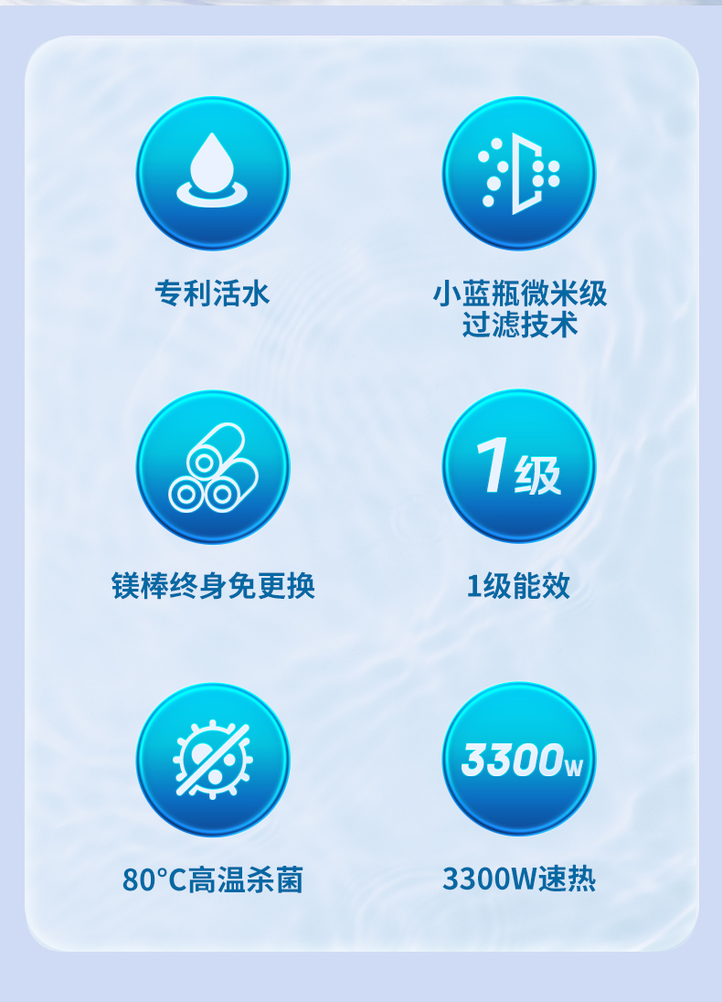 专利活水技术 小蓝瓶微米级过滤技术 镁棒终身免更换 1级能效 80°C高温杀菌 3300W速热